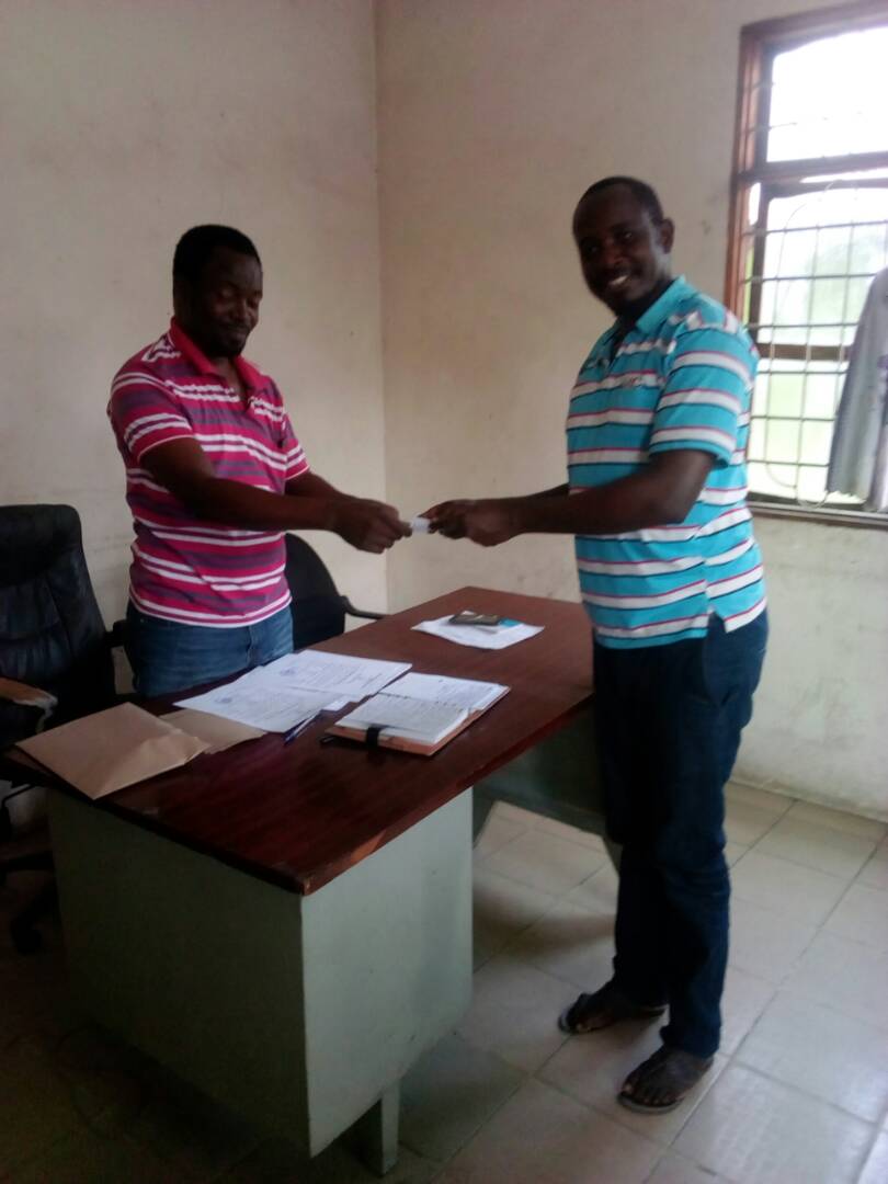 Ukonga Daniel Ruhuro (kushoto) akimkabidhi Katibu wa Kamati tendaji Kata ya